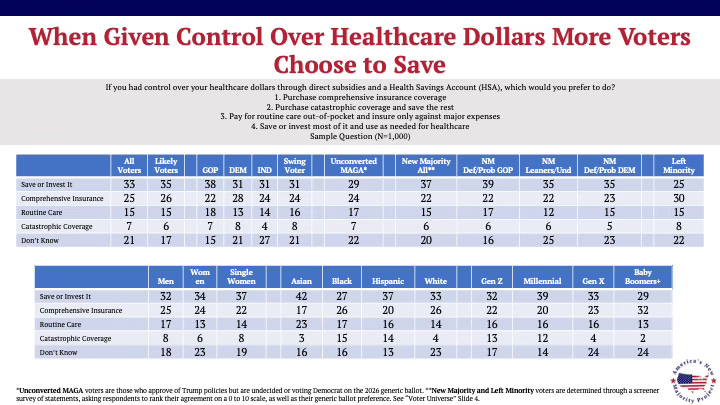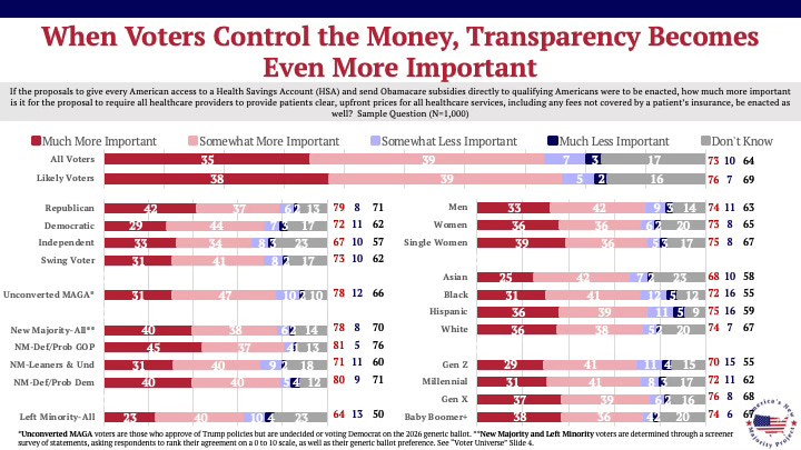 When voters have control over their healthcare dollars through HSAs and direct subsidies, demand for transparent pricing doesn’t fade, it intensifies. Nearly three in four say it becomes even more important. Support holds across party, gender, generation, and class.