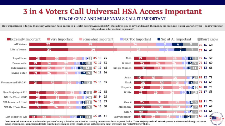 Among target voters, 68% of Unconverted MAGA voters support universal HSA access, and 76% of New Majority voters support it.