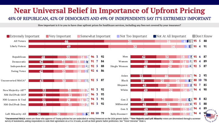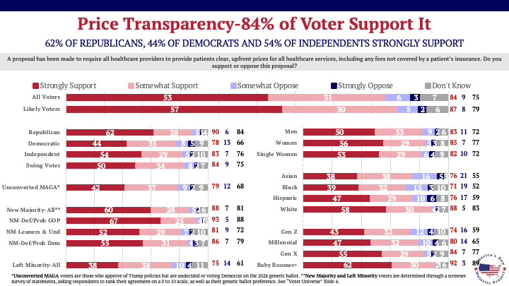 Price transparency is the foundation of reform, with sustained support. In a May 2023 America’s New Majority Project survey, it commanded 85% support and holds at 84% nearly three years later. 93% say price transparency it personally important. This isn’t a flash in the pan, it’s a consistent call for reform.