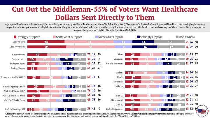 Among target voters, 59% of Unconverted MAGA voters support direct subsidies, and 64% of New Majority voters support it.