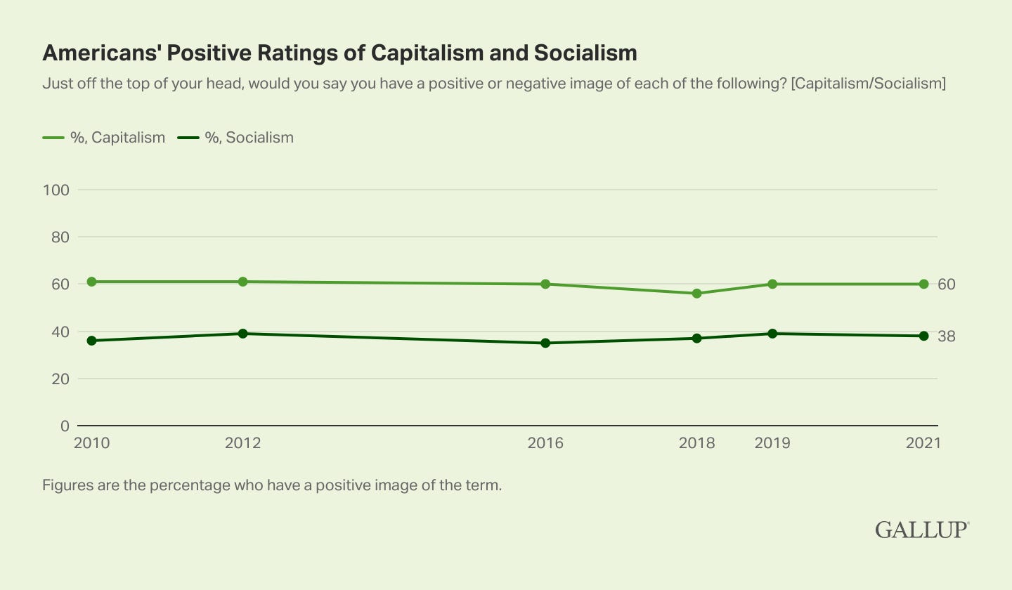 Americans' positive ratings of capitalism and socialism. Sixty percent of U.S. adults in 2021 have a positive image of capitalism, and 38% have a positive image of socialism. These ratings have been stable over time.